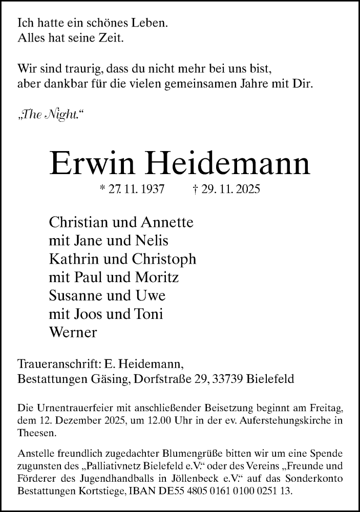 Hier finden Sie alle Traueranzeigen aus der Zeitung, die bisher für Erwin Heidemann erschienen sind. Weitere Traueranzeigen, die in der Zeitung erscheinen, werden hier ebenfalls aufgelistet