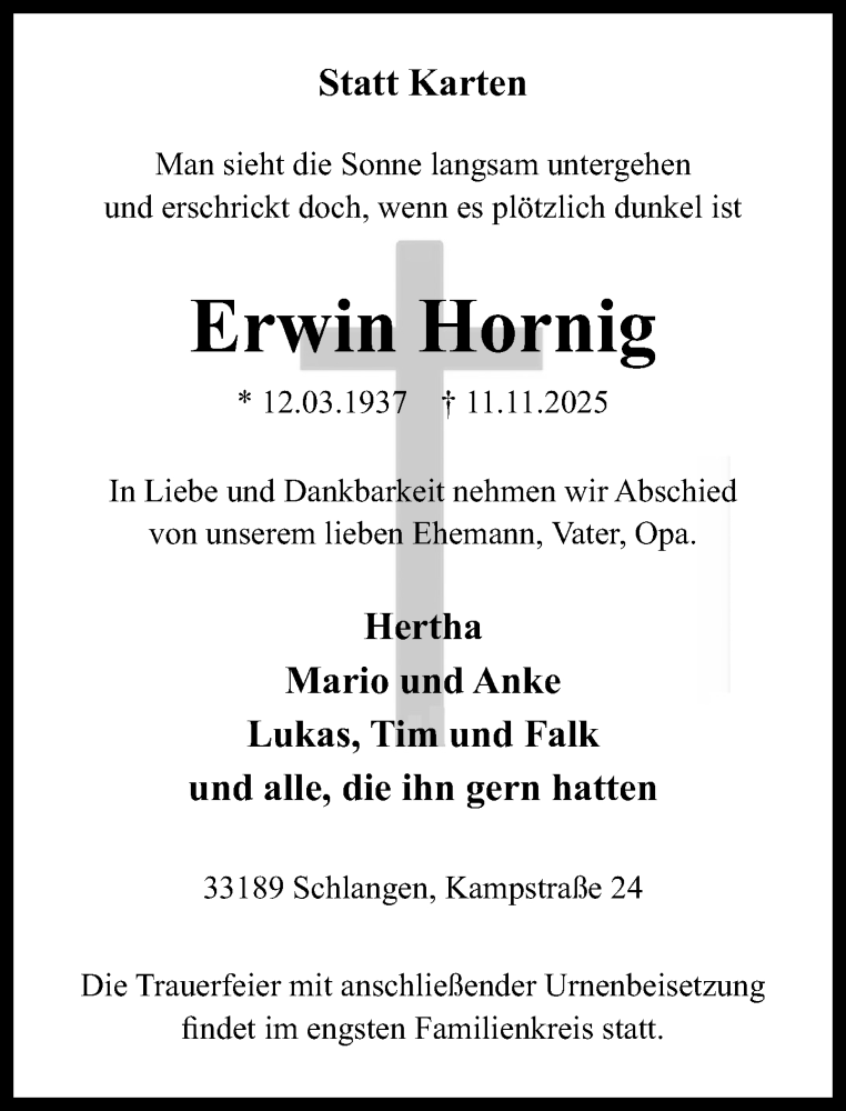 Hier finden Sie alle Traueranzeigen aus der Zeitung, die bisher für Erwin Hornig erschienen sind. Weitere Traueranzeigen, die in der Zeitung erscheinen, werden hier ebenfalls aufgelistet