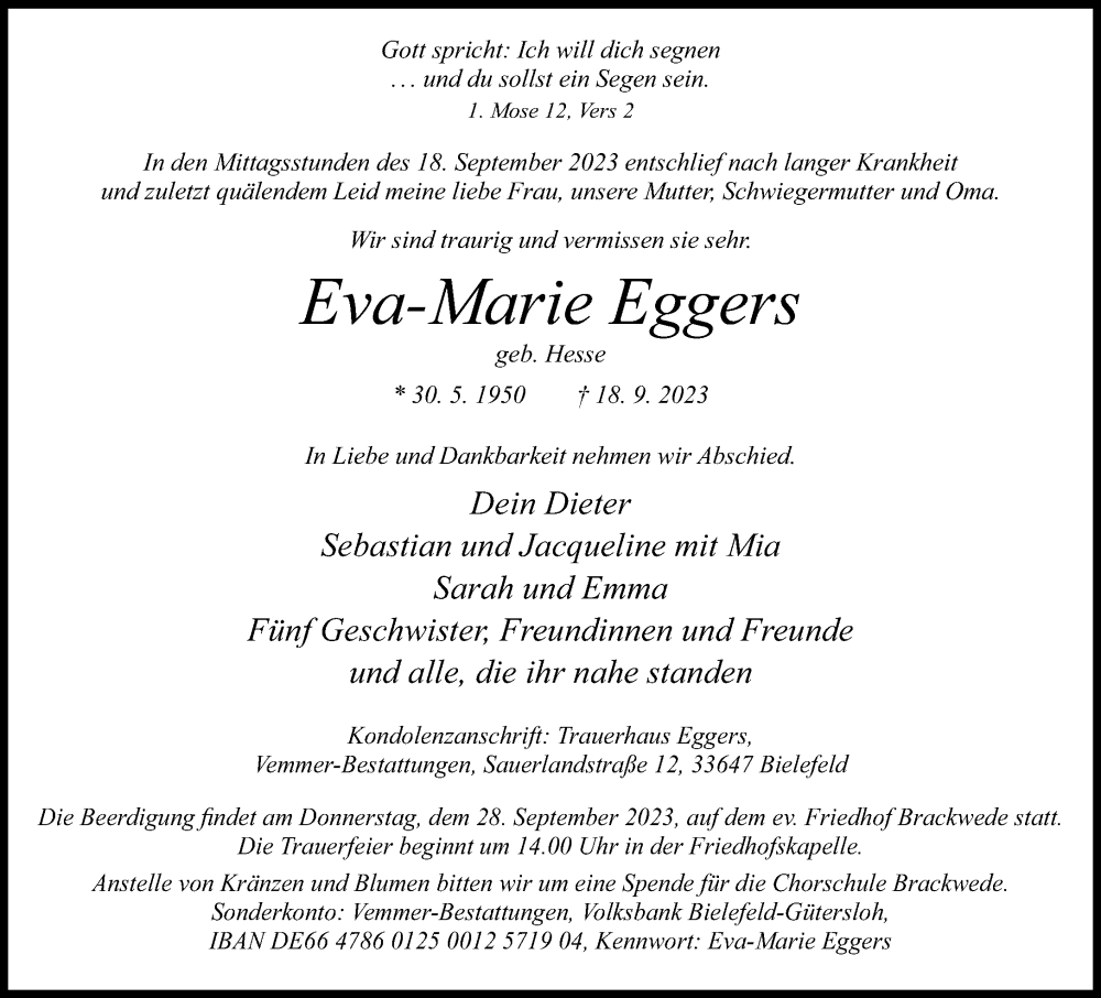 Hier finden Sie alle Traueranzeigen aus der Zeitung, die bisher für Eva-Marie Eggers erschienen sind. Weitere Traueranzeigen, die in der Zeitung erscheinen, werden hier ebenfalls aufgelistet
