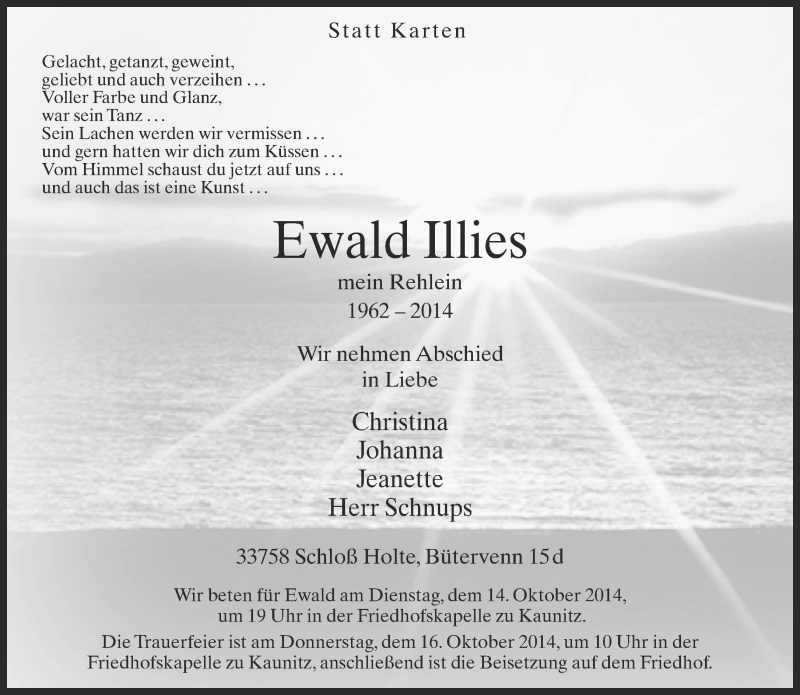 Hier finden Sie alle Traueranzeigen aus der Zeitung, die bisher für Ewald Illies erschienen sind. Weitere Traueranzeigen, die in der Zeitung erscheinen, werden hier ebenfalls aufgelistet