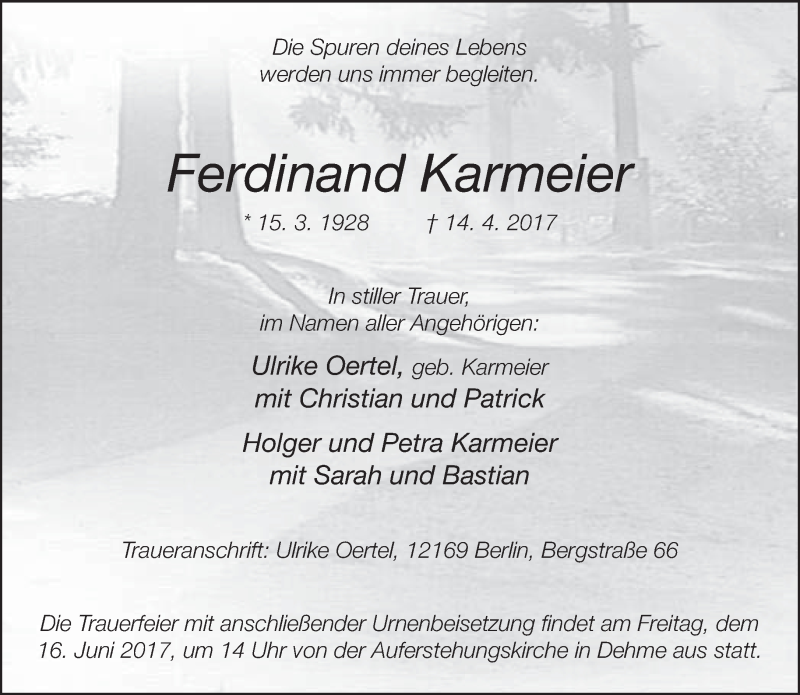 Hier finden Sie alle Traueranzeigen aus der Zeitung, die bisher für Ferdinand Karmeier erschienen sind. Weitere Traueranzeigen, die in der Zeitung erscheinen, werden hier ebenfalls aufgelistet