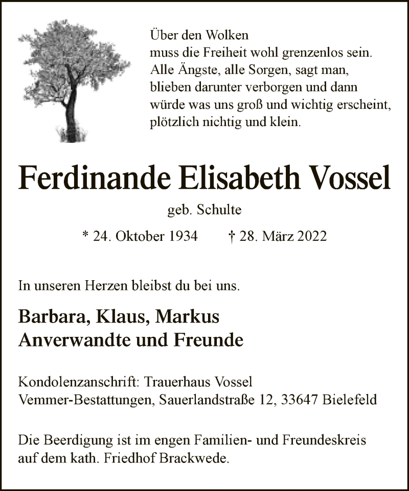 Hier finden Sie alle Traueranzeigen aus der Zeitung, die bisher für Ferdinande Elisabeth Vossel erschienen sind. Weitere Traueranzeigen, die in der Zeitung erscheinen, werden hier ebenfalls aufgelistet