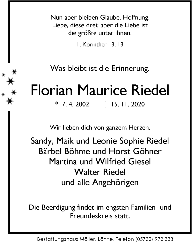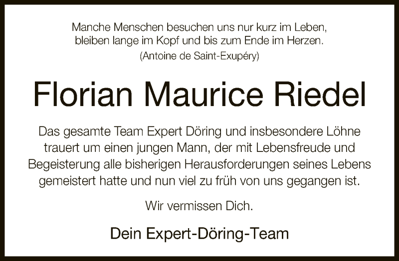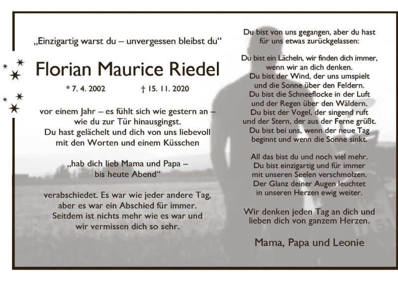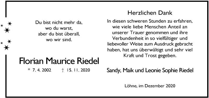 Hier finden Sie alle Traueranzeigen aus der Zeitung, die bisher für Florian Maurice Riedel erschienen sind. Weitere Traueranzeigen, die in der Zeitung erscheinen, werden hier ebenfalls aufgelistet