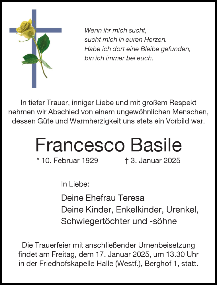Hier finden Sie alle Traueranzeigen aus der Zeitung, die bisher für Francesco Basile erschienen sind. Weitere Traueranzeigen, die in der Zeitung erscheinen, werden hier ebenfalls aufgelistet