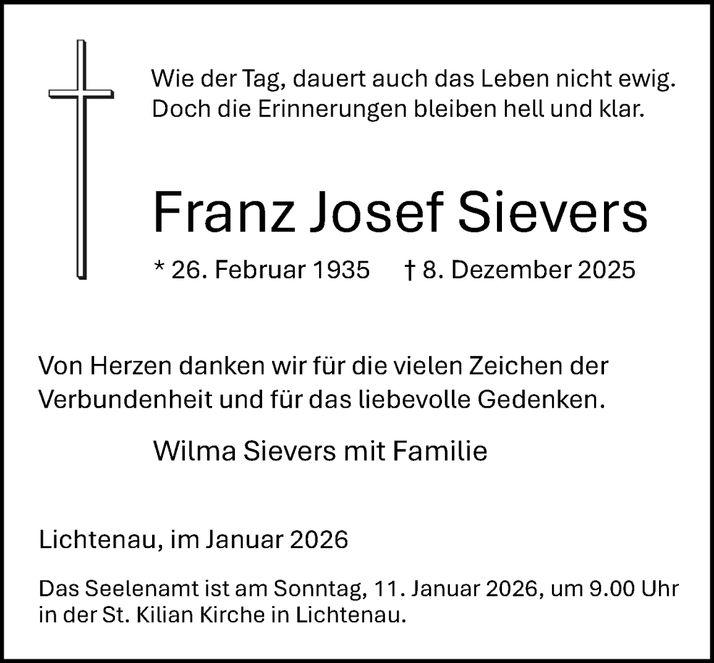 Hier finden Sie alle Traueranzeigen aus der Zeitung, die bisher für Franz Josef Sievers erschienen sind. Weitere Traueranzeigen, die in der Zeitung erscheinen, werden hier ebenfalls aufgelistet