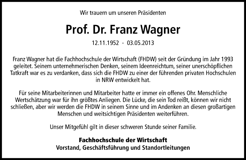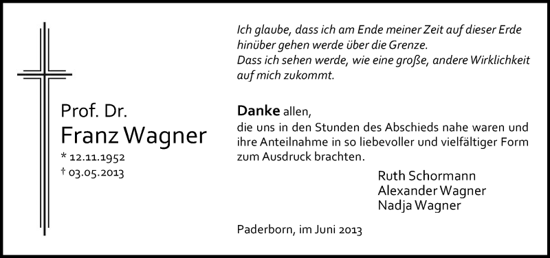 Hier finden Sie alle Traueranzeigen aus der Zeitung, die bisher für Franz Wagner erschienen sind. Weitere Traueranzeigen, die in der Zeitung erscheinen, werden hier ebenfalls aufgelistet