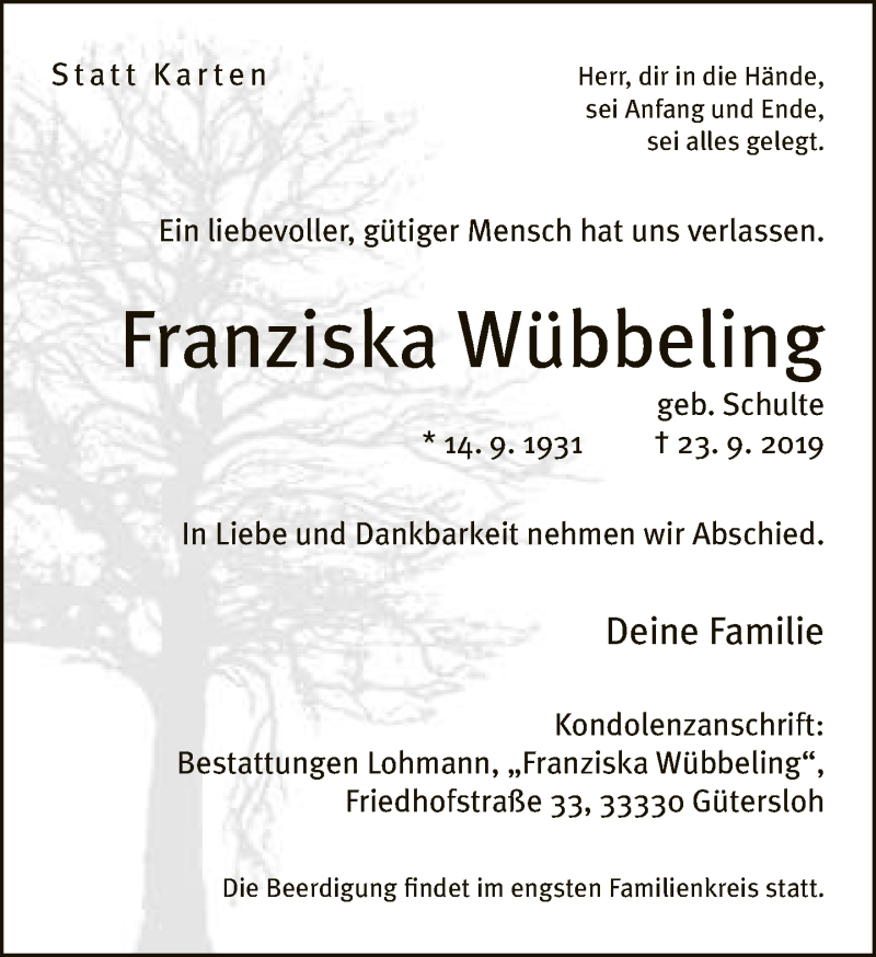 Hier finden Sie alle Traueranzeigen aus der Zeitung, die bisher für Franziska Wübbeling erschienen sind. Weitere Traueranzeigen, die in der Zeitung erscheinen, werden hier ebenfalls aufgelistet