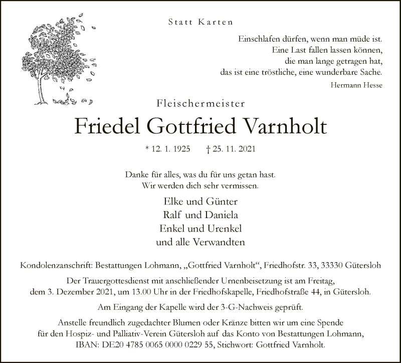 Hier finden Sie alle Traueranzeigen aus der Zeitung, die bisher für Friedel Gottfried Varnholt erschienen sind. Weitere Traueranzeigen, die in der Zeitung erscheinen, werden hier ebenfalls aufgelistet