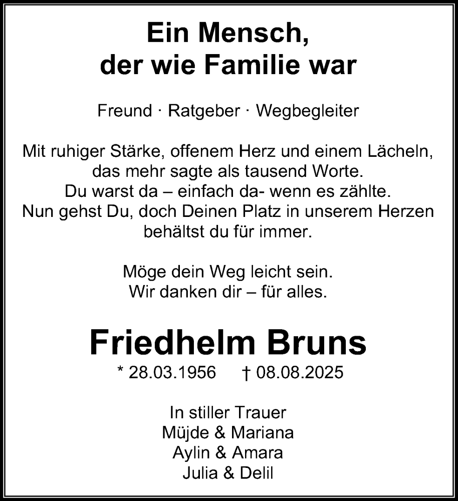 Hier finden Sie alle Traueranzeigen aus der Zeitung, die bisher für Friedhelm Bruns erschienen sind. Weitere Traueranzeigen, die in der Zeitung erscheinen, werden hier ebenfalls aufgelistet