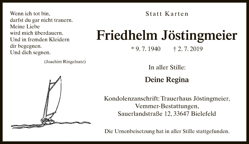 Hier finden Sie alle Traueranzeigen aus der Zeitung, die bisher für Friedhelm Jöstingmeier erschienen sind. Weitere Traueranzeigen, die in der Zeitung erscheinen, werden hier ebenfalls aufgelistet