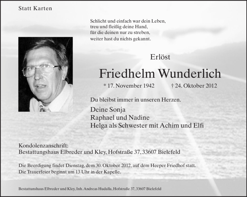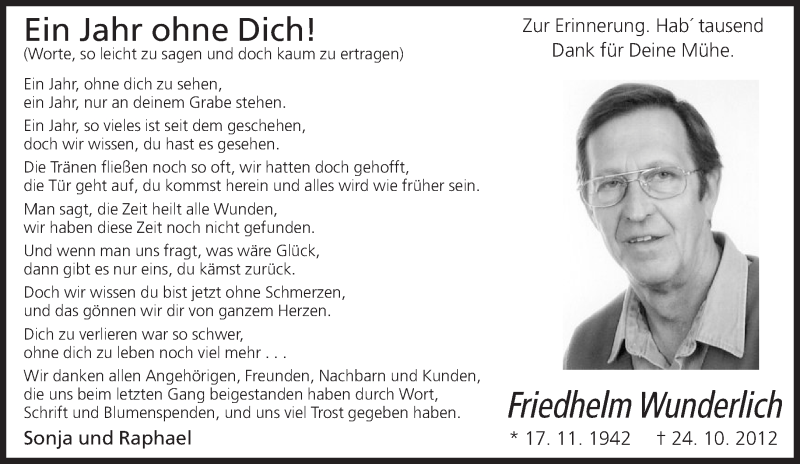 Hier finden Sie alle Traueranzeigen aus der Zeitung, die bisher für Friedhelm Wunderlich erschienen sind. Weitere Traueranzeigen, die in der Zeitung erscheinen, werden hier ebenfalls aufgelistet