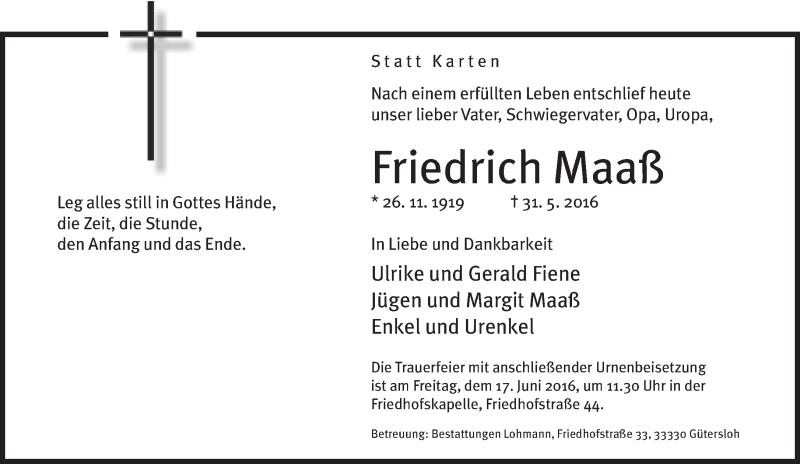 Hier finden Sie alle Traueranzeigen aus der Zeitung, die bisher für Friedrich Maaß erschienen sind. Weitere Traueranzeigen, die in der Zeitung erscheinen, werden hier ebenfalls aufgelistet