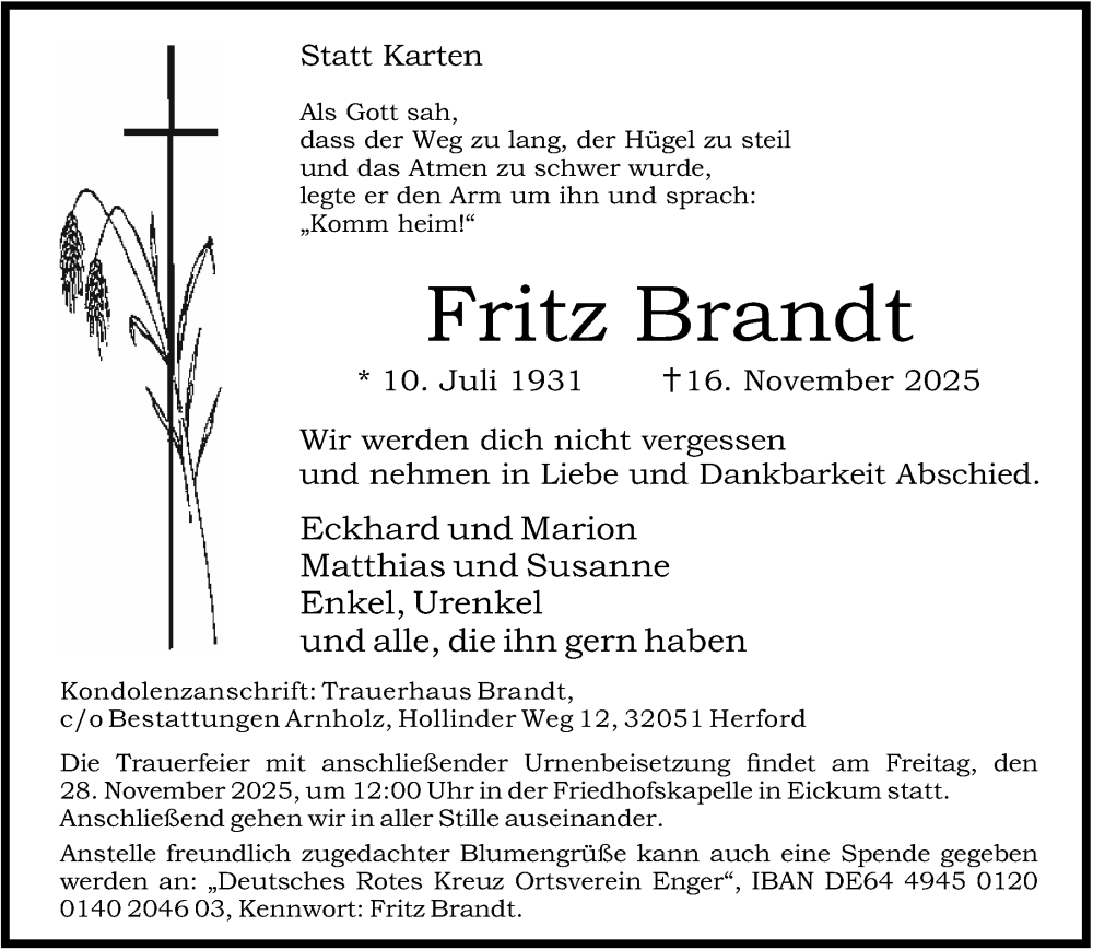Hier finden Sie alle Traueranzeigen aus der Zeitung, die bisher für Fritz Brandt erschienen sind. Weitere Traueranzeigen, die in der Zeitung erscheinen, werden hier ebenfalls aufgelistet