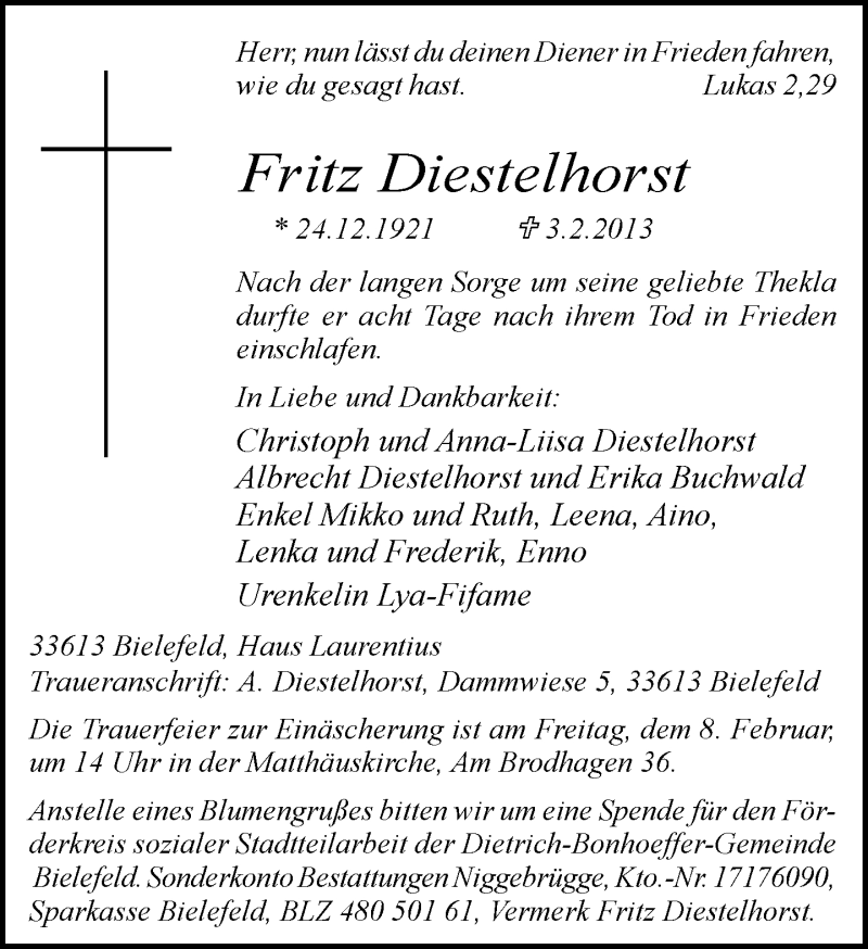 Hier finden Sie alle Traueranzeigen aus der Zeitung, die bisher für Fritz Diestelhorst erschienen sind. Weitere Traueranzeigen, die in der Zeitung erscheinen, werden hier ebenfalls aufgelistet