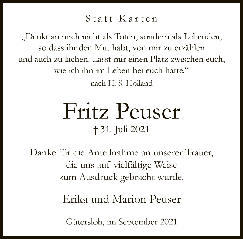 Hier finden Sie alle Traueranzeigen aus der Zeitung, die bisher für Fritz Peuser erschienen sind. Weitere Traueranzeigen, die in der Zeitung erscheinen, werden hier ebenfalls aufgelistet