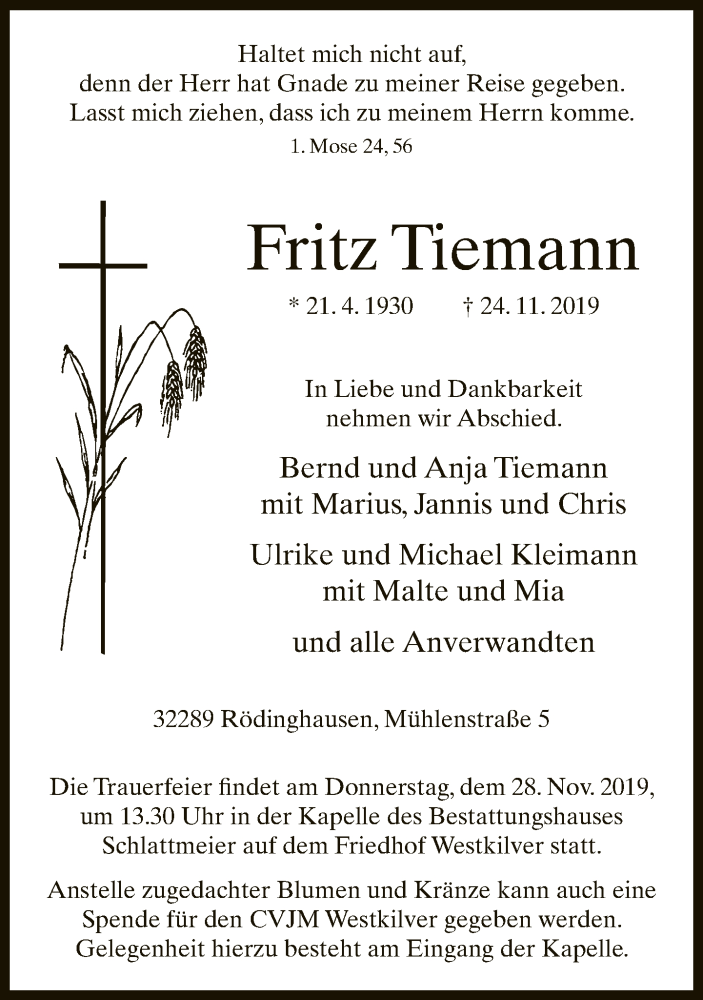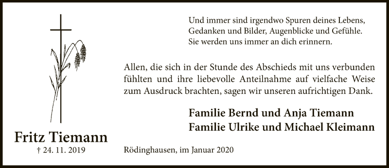 Hier finden Sie alle Traueranzeigen aus der Zeitung, die bisher für Fritz Tiemann erschienen sind. Weitere Traueranzeigen, die in der Zeitung erscheinen, werden hier ebenfalls aufgelistet