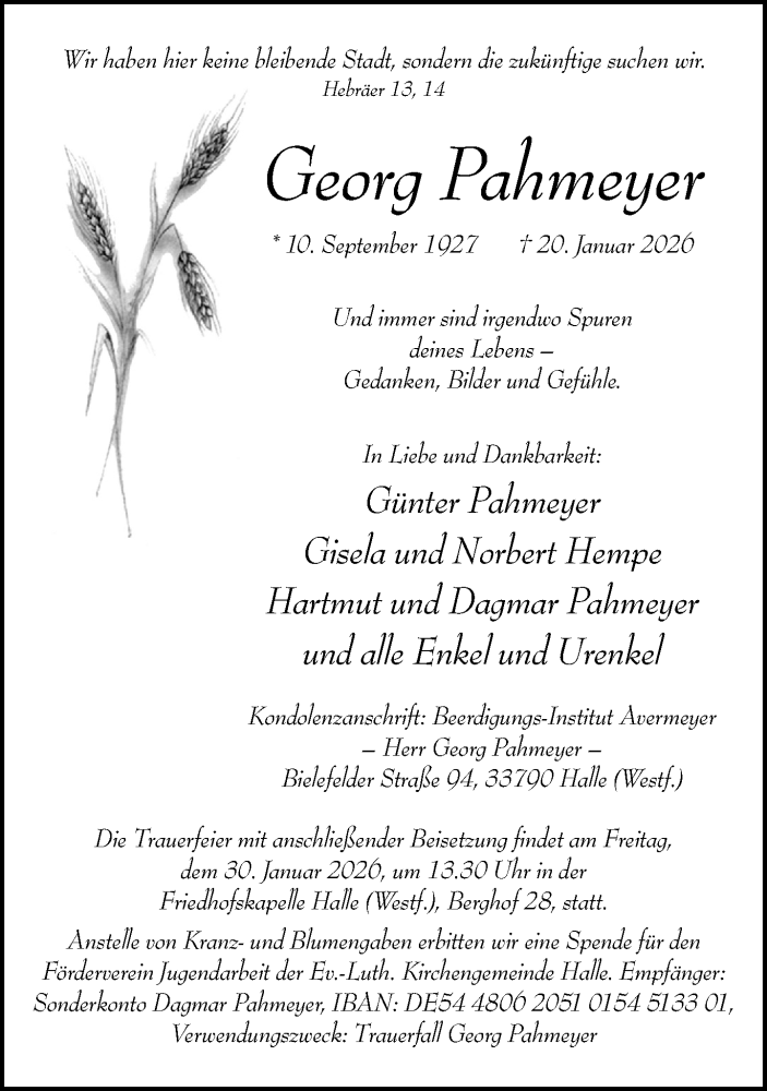 Hier finden Sie alle Traueranzeigen aus der Zeitung, die bisher für Georg Pahmeyer erschienen sind. Weitere Traueranzeigen, die in der Zeitung erscheinen, werden hier ebenfalls aufgelistet
