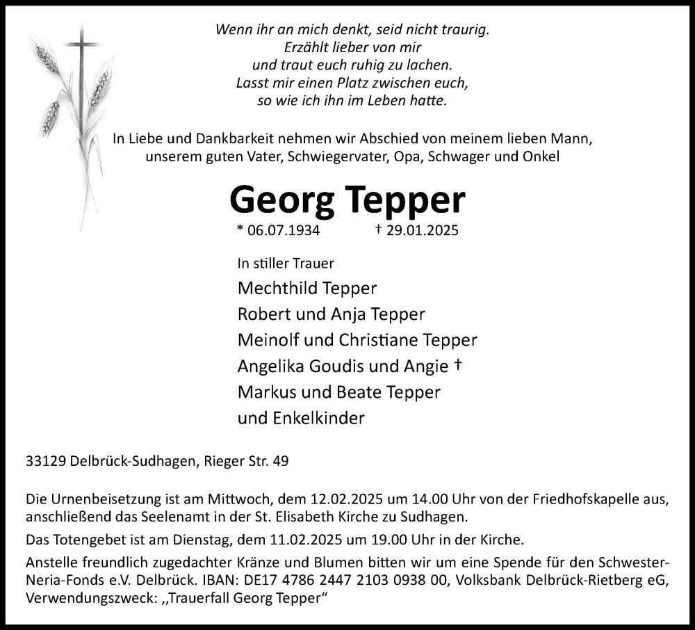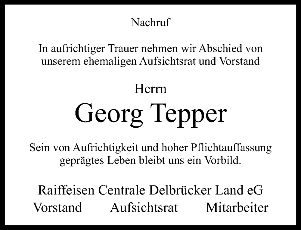 Hier finden Sie alle Traueranzeigen aus der Zeitung, die bisher für Georg Tepper erschienen sind. Weitere Traueranzeigen, die in der Zeitung erscheinen, werden hier ebenfalls aufgelistet