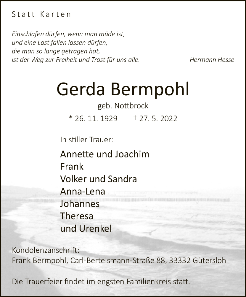 Hier finden Sie alle Traueranzeigen aus der Zeitung, die bisher für Gerda Bermpohl erschienen sind. Weitere Traueranzeigen, die in der Zeitung erscheinen, werden hier ebenfalls aufgelistet