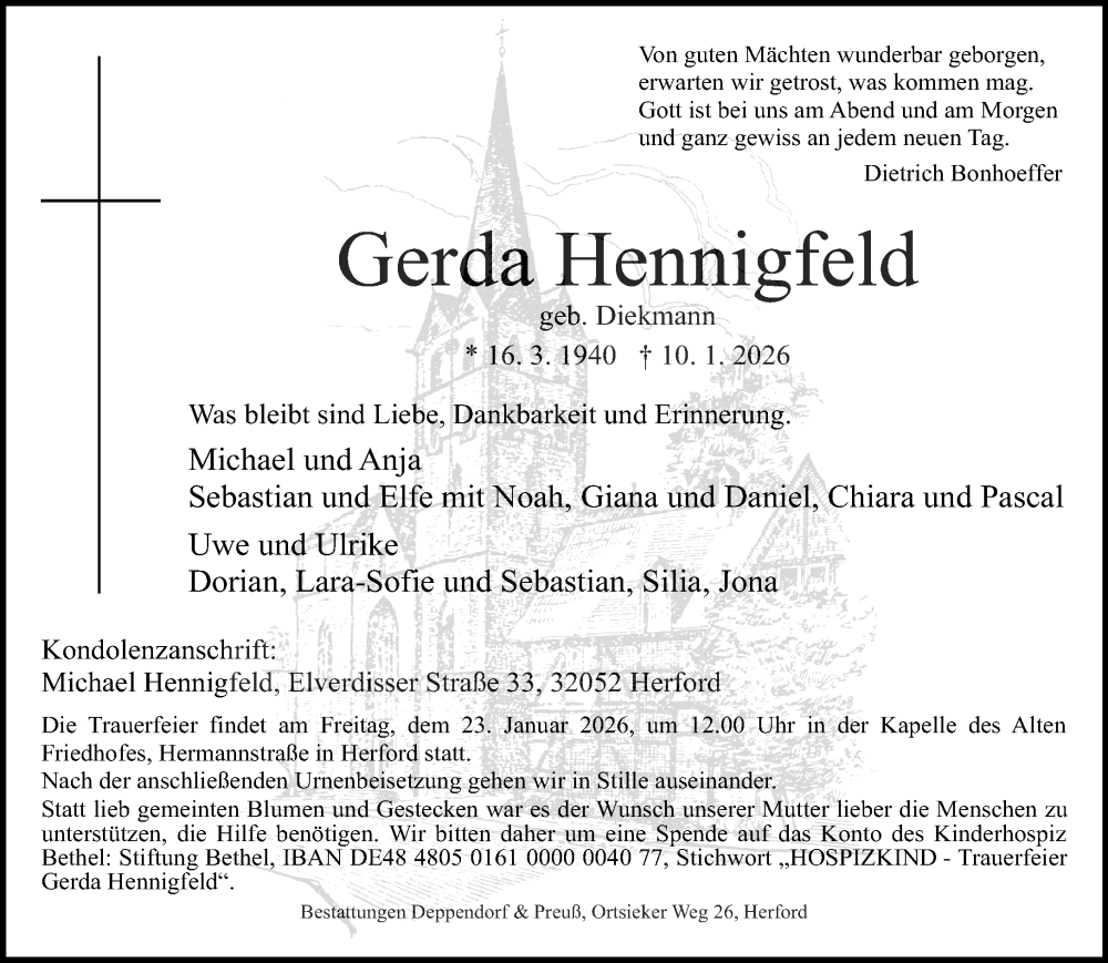 Hier finden Sie alle Traueranzeigen aus der Zeitung, die bisher für Gerda Hennigfeld erschienen sind. Weitere Traueranzeigen, die in der Zeitung erscheinen, werden hier ebenfalls aufgelistet