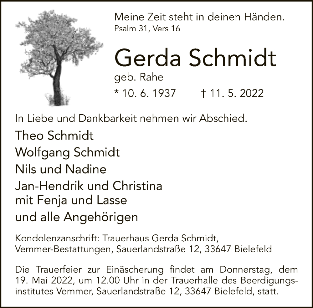 Hier finden Sie alle Traueranzeigen aus der Zeitung, die bisher für Gerda Schmidt erschienen sind. Weitere Traueranzeigen, die in der Zeitung erscheinen, werden hier ebenfalls aufgelistet