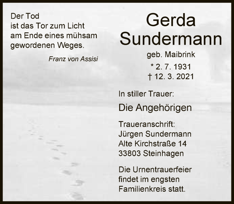 Hier finden Sie alle Traueranzeigen aus der Zeitung, die bisher für Gerda Sundermann erschienen sind. Weitere Traueranzeigen, die in der Zeitung erscheinen, werden hier ebenfalls aufgelistet