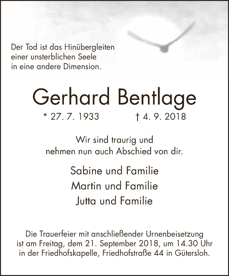 Hier finden Sie alle Traueranzeigen aus der Zeitung, die bisher für Gerhard Bentlage erschienen sind. Weitere Traueranzeigen, die in der Zeitung erscheinen, werden hier ebenfalls aufgelistet