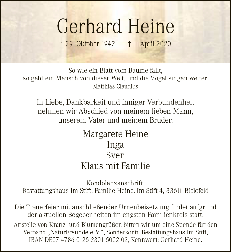 Hier finden Sie alle Traueranzeigen aus der Zeitung, die bisher für Gerhard Heine erschienen sind. Weitere Traueranzeigen, die in der Zeitung erscheinen, werden hier ebenfalls aufgelistet