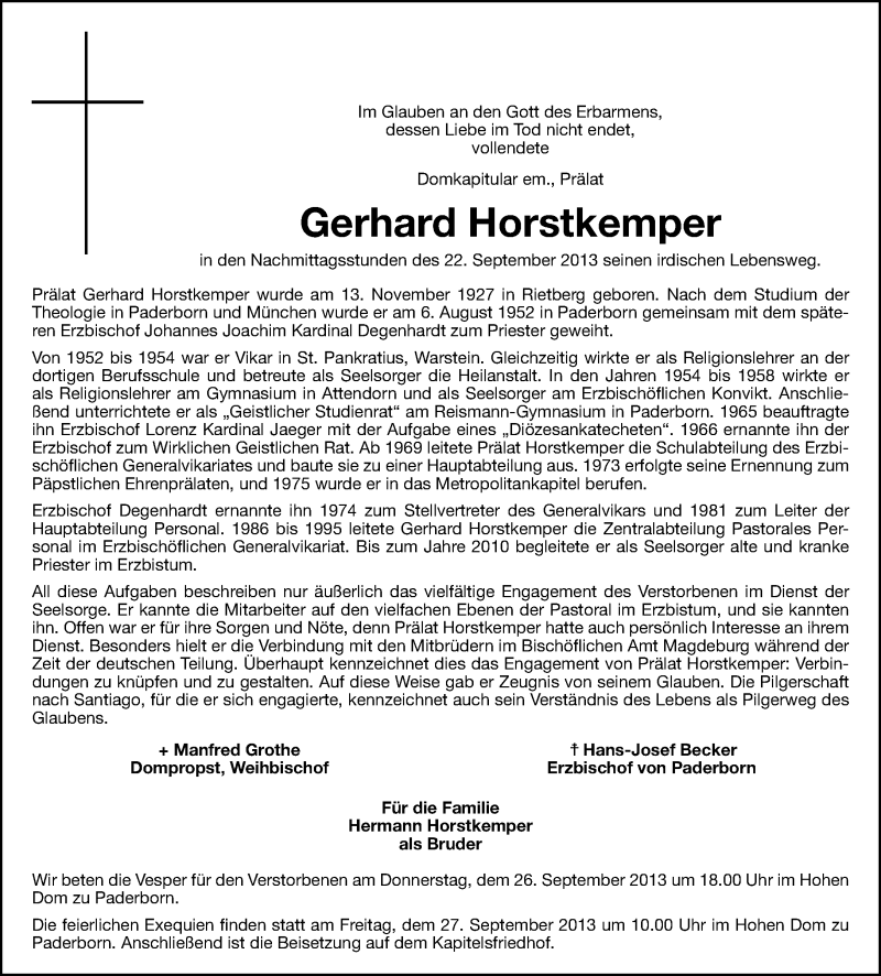 Hier finden Sie alle Traueranzeigen aus der Zeitung, die bisher für Gerhard Horstkemper erschienen sind. Weitere Traueranzeigen, die in der Zeitung erscheinen, werden hier ebenfalls aufgelistet