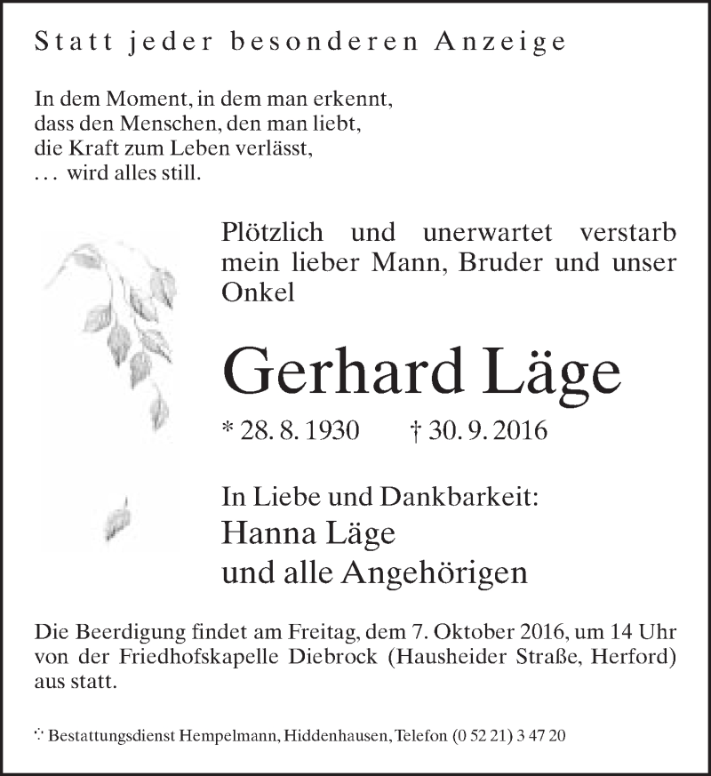 Hier finden Sie alle Traueranzeigen aus der Zeitung, die bisher für Gerhard Läge erschienen sind. Weitere Traueranzeigen, die in der Zeitung erscheinen, werden hier ebenfalls aufgelistet