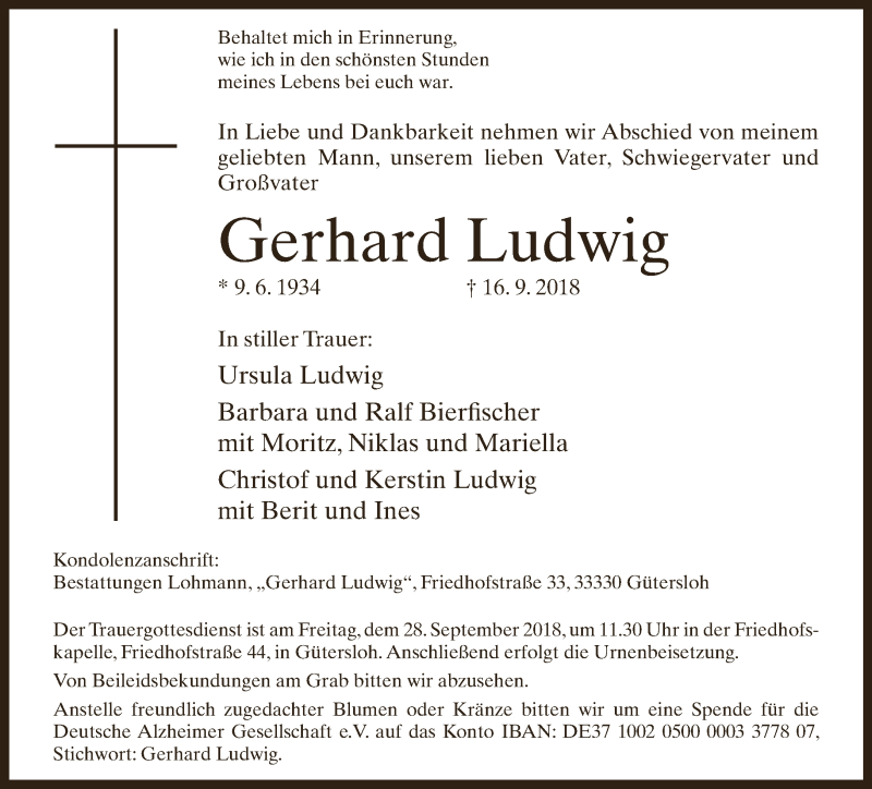 Hier finden Sie alle Traueranzeigen aus der Zeitung, die bisher für Gerhard Ludwig erschienen sind. Weitere Traueranzeigen, die in der Zeitung erscheinen, werden hier ebenfalls aufgelistet