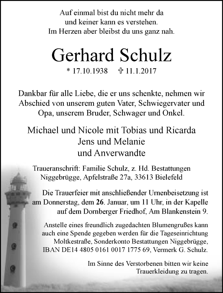 Hier finden Sie alle Traueranzeigen aus der Zeitung, die bisher für Gerhard Schulz erschienen sind. Weitere Traueranzeigen, die in der Zeitung erscheinen, werden hier ebenfalls aufgelistet