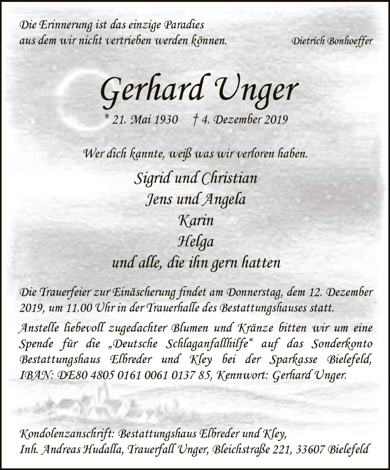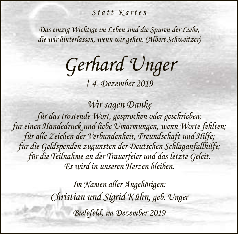 Hier finden Sie alle Traueranzeigen aus der Zeitung, die bisher für Gerhard Unger erschienen sind. Weitere Traueranzeigen, die in der Zeitung erscheinen, werden hier ebenfalls aufgelistet