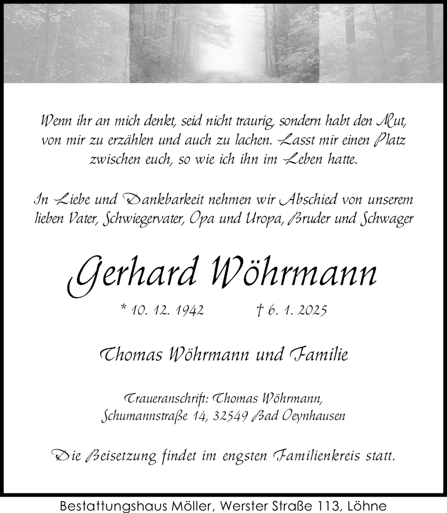 Hier finden Sie alle Traueranzeigen aus der Zeitung, die bisher für Gerhard Wöhrmann erschienen sind. Weitere Traueranzeigen, die in der Zeitung erscheinen, werden hier ebenfalls aufgelistet