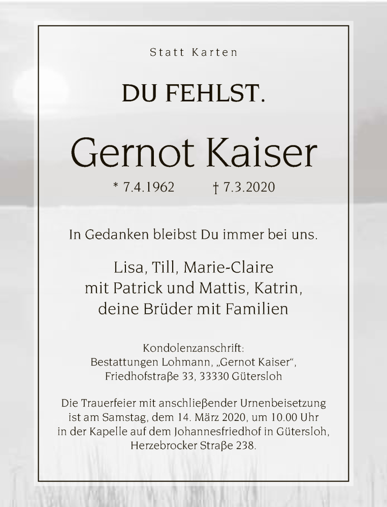 Hier finden Sie alle Traueranzeigen aus der Zeitung, die bisher für Gernot Kaiser erschienen sind. Weitere Traueranzeigen, die in der Zeitung erscheinen, werden hier ebenfalls aufgelistet