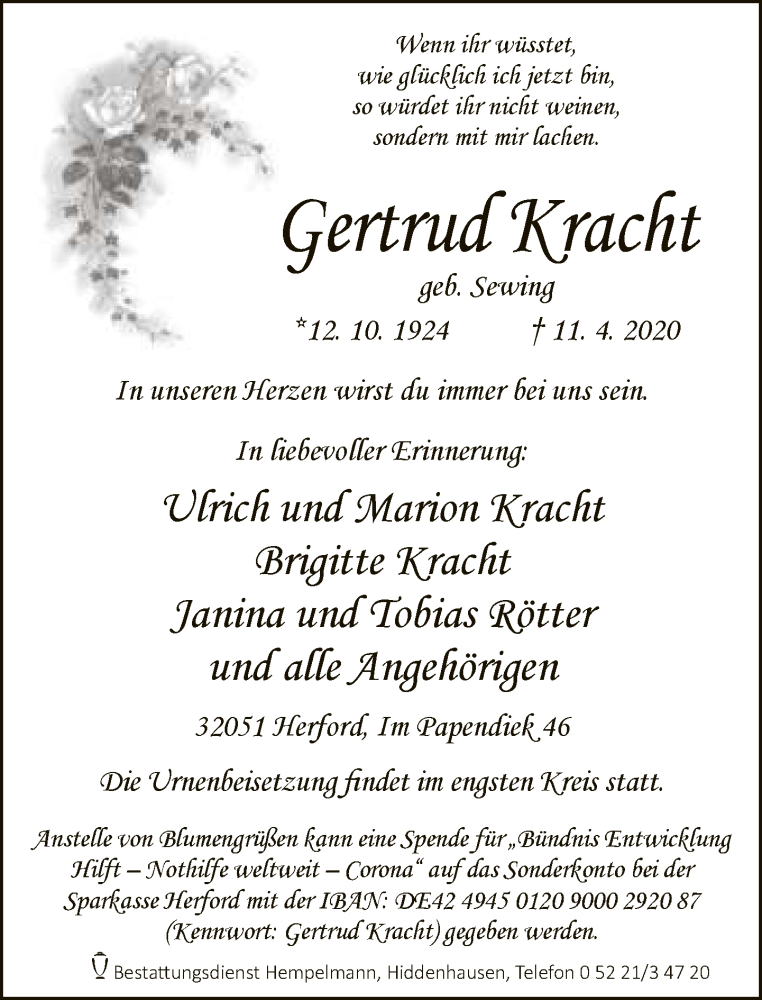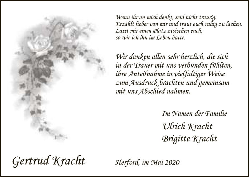 Hier finden Sie alle Traueranzeigen aus der Zeitung, die bisher für Gertrud Kracht erschienen sind. Weitere Traueranzeigen, die in der Zeitung erscheinen, werden hier ebenfalls aufgelistet