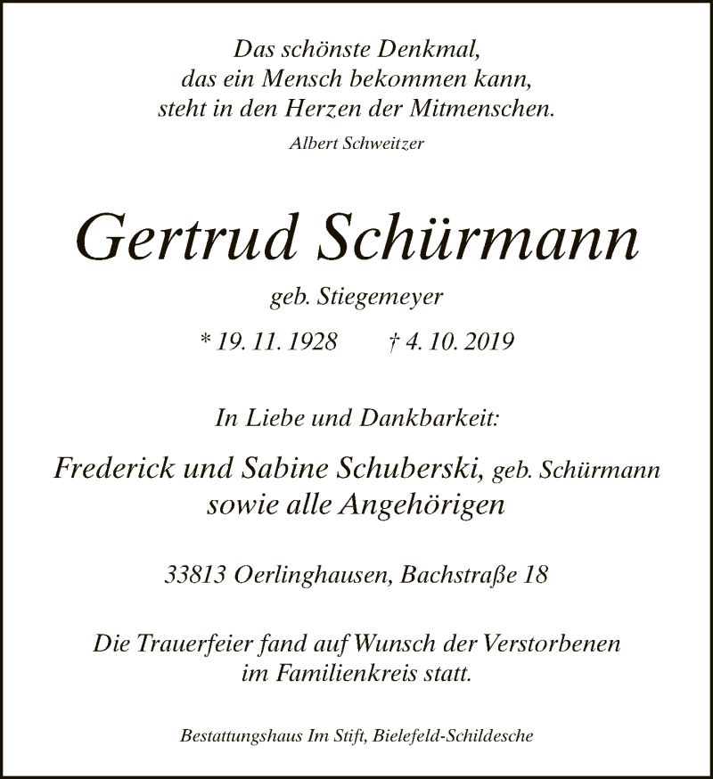 Hier finden Sie alle Traueranzeigen aus der Zeitung, die bisher für Gertrud Schürmann erschienen sind. Weitere Traueranzeigen, die in der Zeitung erscheinen, werden hier ebenfalls aufgelistet