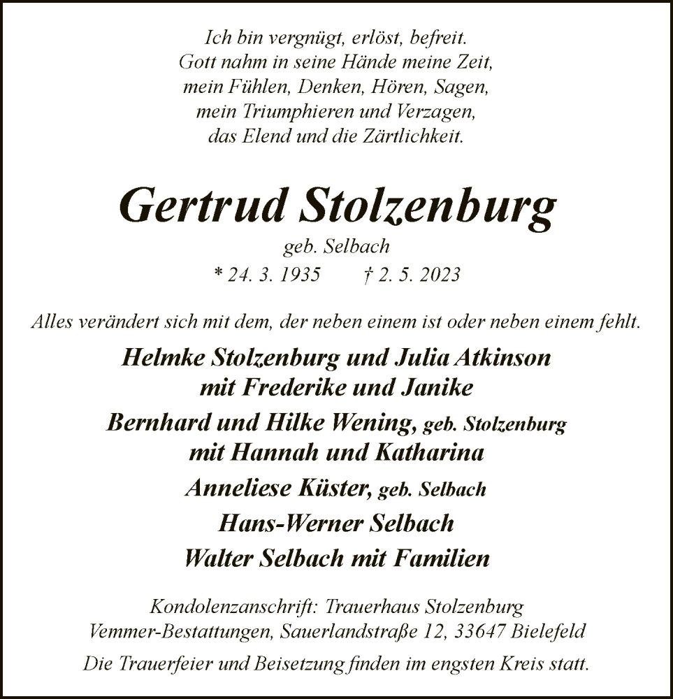 Hier finden Sie alle Traueranzeigen aus der Zeitung, die bisher für Gertrud Stolzenburg erschienen sind. Weitere Traueranzeigen, die in der Zeitung erscheinen, werden hier ebenfalls aufgelistet