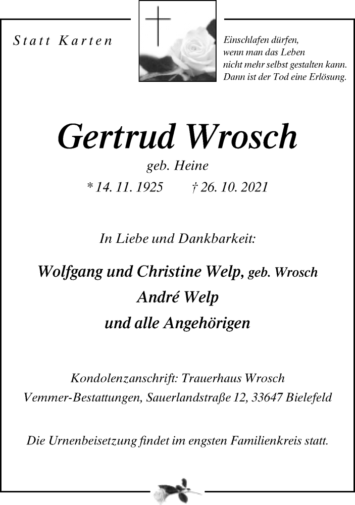 Hier finden Sie alle Traueranzeigen aus der Zeitung, die bisher für Gertrud Wrosch erschienen sind. Weitere Traueranzeigen, die in der Zeitung erscheinen, werden hier ebenfalls aufgelistet