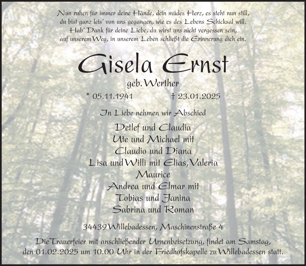 Hier finden Sie alle Traueranzeigen aus der Zeitung, die bisher für Gisela Ernst erschienen sind. Weitere Traueranzeigen, die in der Zeitung erscheinen, werden hier ebenfalls aufgelistet