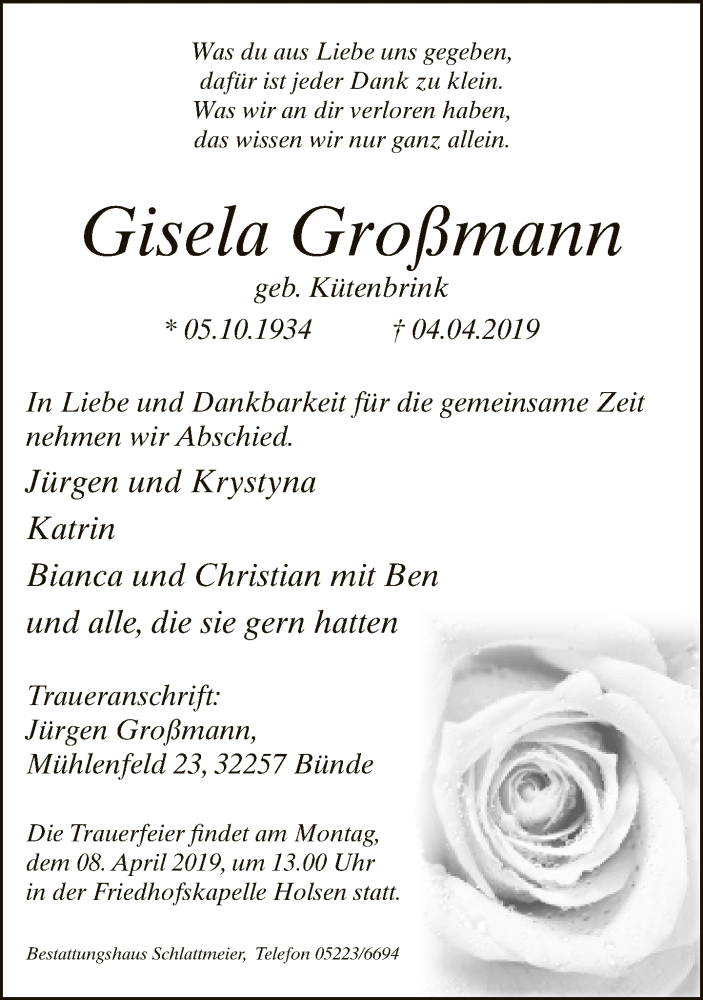 Hier finden Sie alle Traueranzeigen aus der Zeitung, die bisher für Gisela Großmann erschienen sind. Weitere Traueranzeigen, die in der Zeitung erscheinen, werden hier ebenfalls aufgelistet