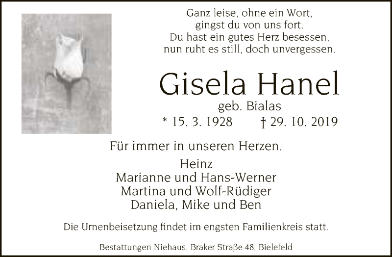Hier finden Sie alle Traueranzeigen aus der Zeitung, die bisher für Gisela Hanel erschienen sind. Weitere Traueranzeigen, die in der Zeitung erscheinen, werden hier ebenfalls aufgelistet