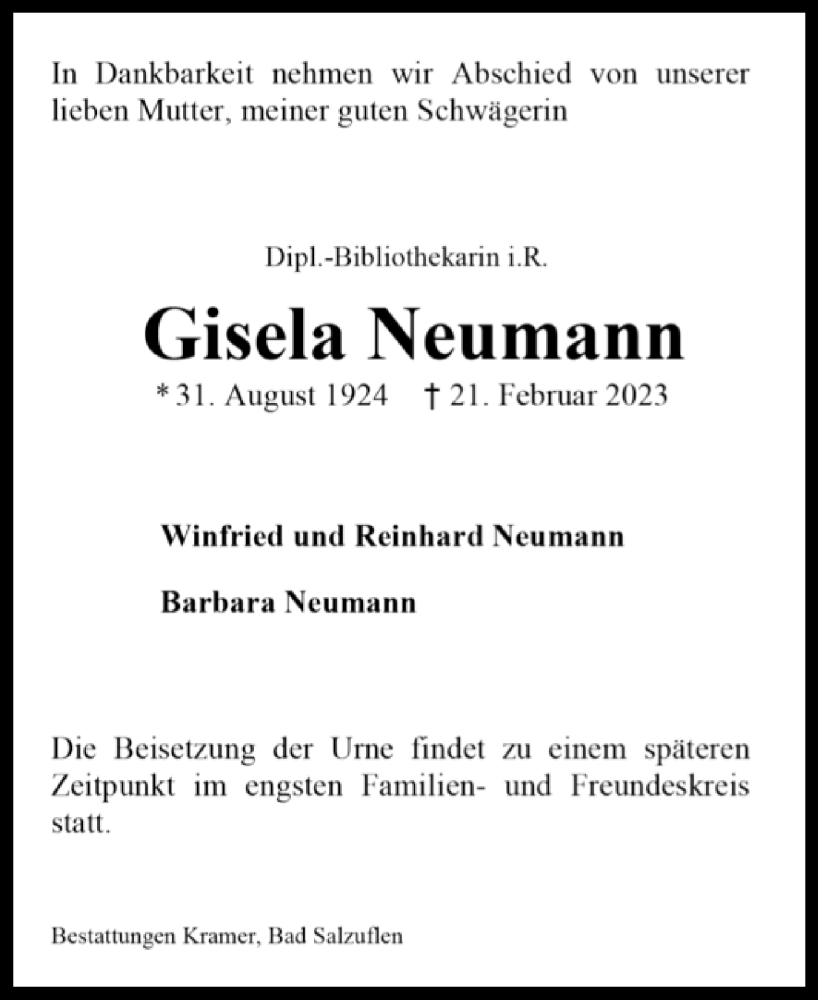 Hier finden Sie alle Traueranzeigen aus der Zeitung, die bisher für Gisela Neumann erschienen sind. Weitere Traueranzeigen, die in der Zeitung erscheinen, werden hier ebenfalls aufgelistet