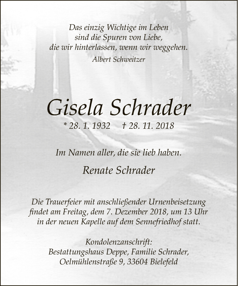 Hier finden Sie alle Traueranzeigen aus der Zeitung, die bisher für Gisela Schrader erschienen sind. Weitere Traueranzeigen, die in der Zeitung erscheinen, werden hier ebenfalls aufgelistet