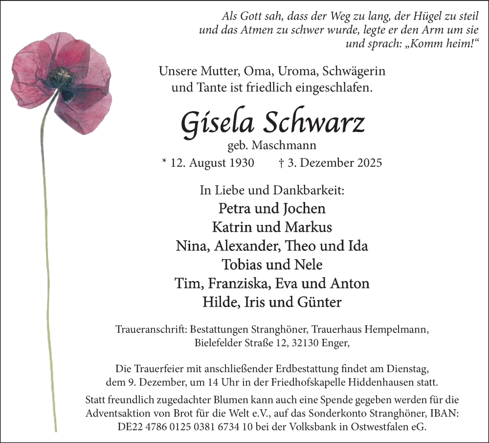 Hier finden Sie alle Traueranzeigen aus der Zeitung, die bisher für Gisela Schwarz erschienen sind. Weitere Traueranzeigen, die in der Zeitung erscheinen, werden hier ebenfalls aufgelistet