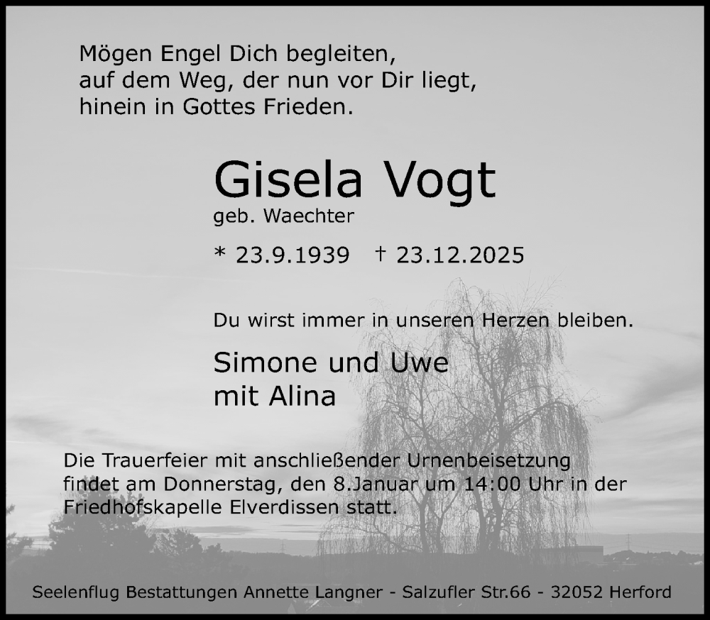 Hier finden Sie alle Traueranzeigen aus der Zeitung, die bisher für Gisela Vogt erschienen sind. Weitere Traueranzeigen, die in der Zeitung erscheinen, werden hier ebenfalls aufgelistet