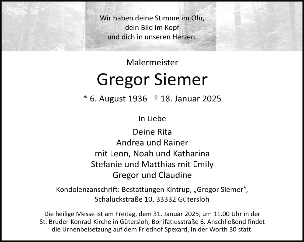 Hier finden Sie alle Traueranzeigen aus der Zeitung, die bisher für Gregor Siemer erschienen sind. Weitere Traueranzeigen, die in der Zeitung erscheinen, werden hier ebenfalls aufgelistet