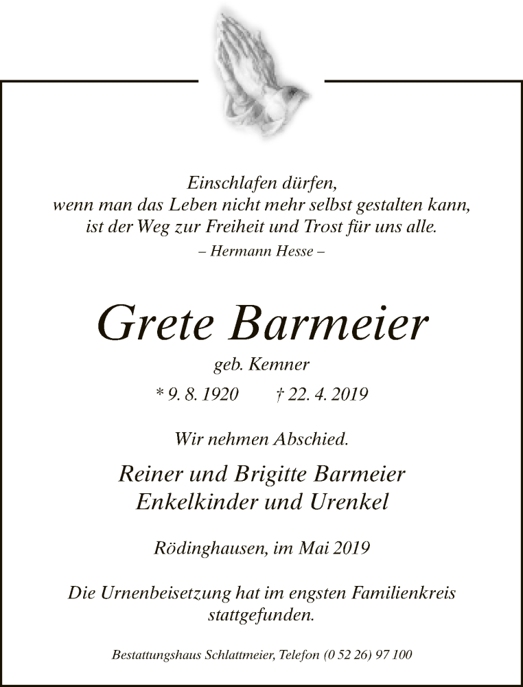 Hier finden Sie alle Traueranzeigen aus der Zeitung, die bisher für Grete Barmeier erschienen sind. Weitere Traueranzeigen, die in der Zeitung erscheinen, werden hier ebenfalls aufgelistet