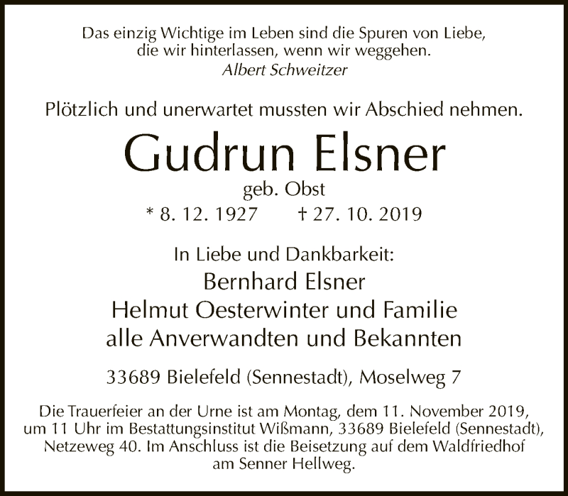 Hier finden Sie alle Traueranzeigen aus der Zeitung, die bisher für Gudrun Elsner erschienen sind. Weitere Traueranzeigen, die in der Zeitung erscheinen, werden hier ebenfalls aufgelistet