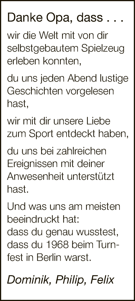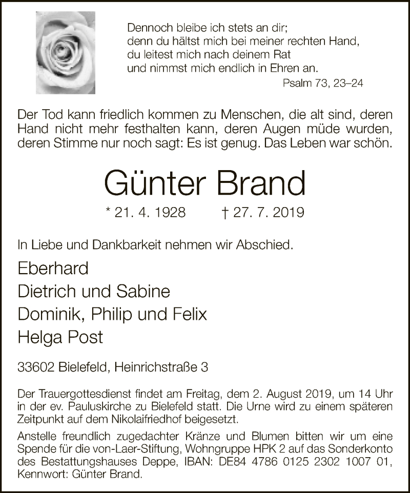 Hier finden Sie alle Traueranzeigen aus der Zeitung, die bisher für Günter Brand erschienen sind. Weitere Traueranzeigen, die in der Zeitung erscheinen, werden hier ebenfalls aufgelistet